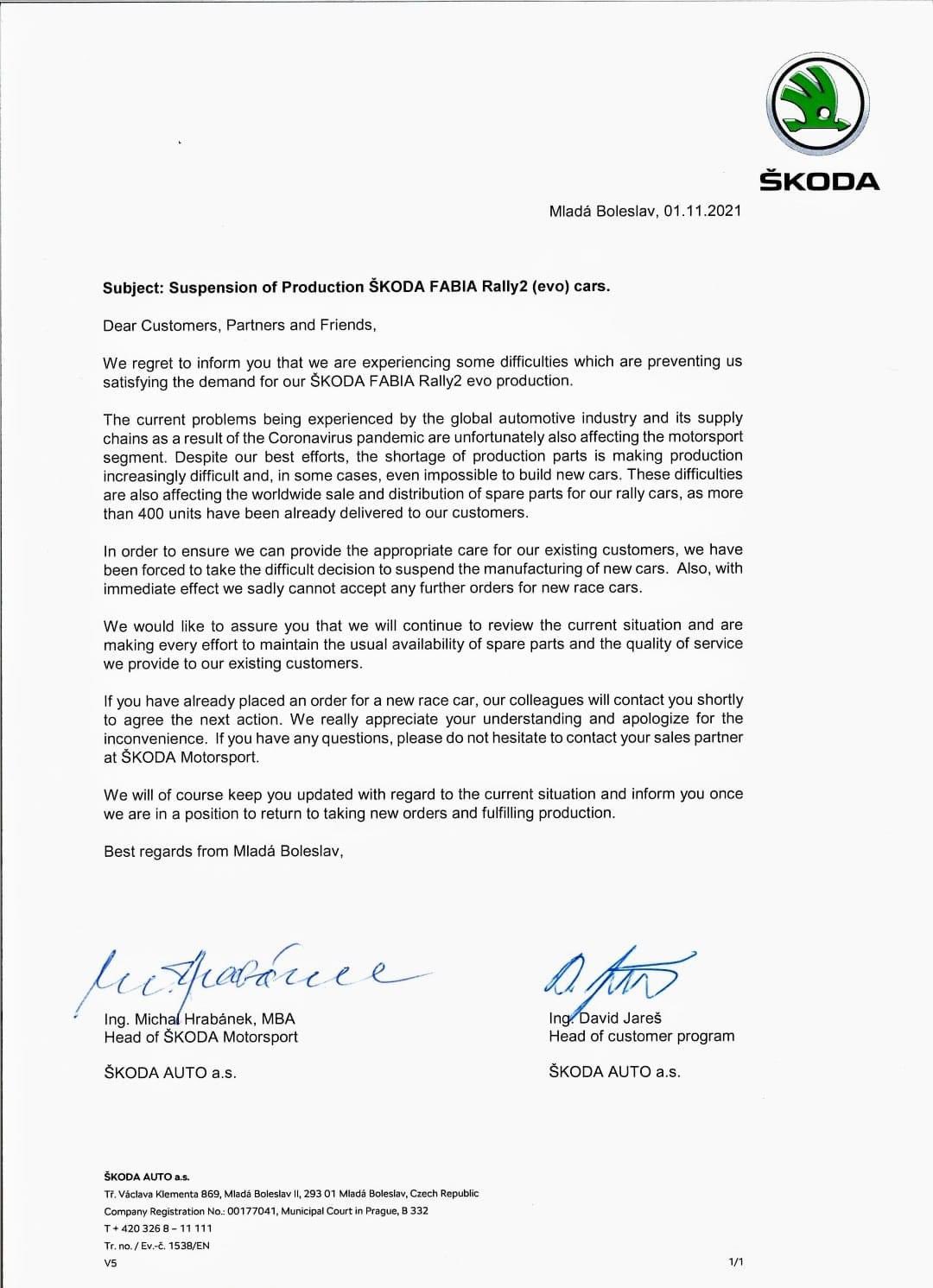 Škoda Motorsport zastavila výrobu Fabií Rally2 ... důvod je nedostatek blíže nejmenovaných dílů pro výrobu https://pbs.twimg.com/media/FDH8K_oWYAQw25F?format=jpg&name=large